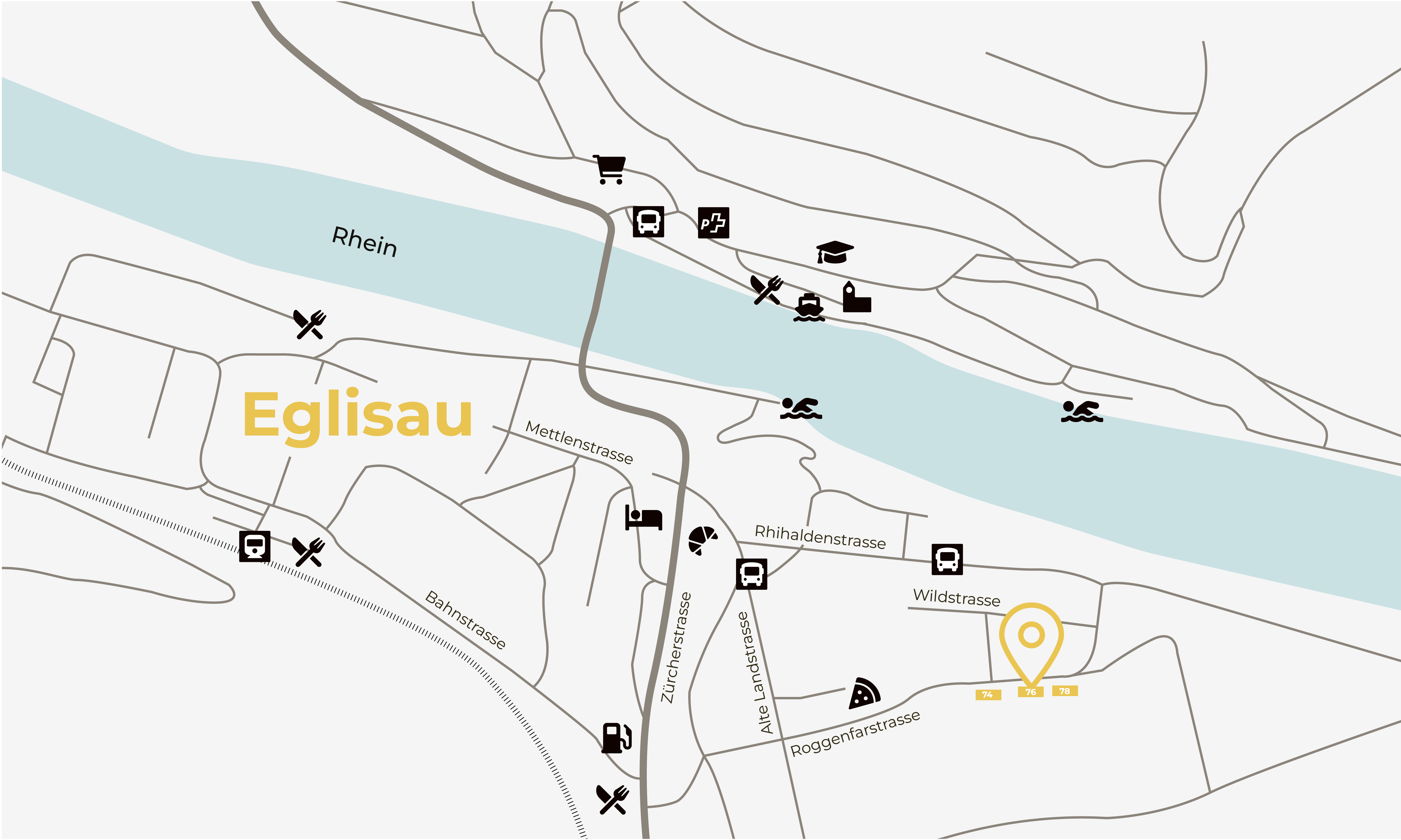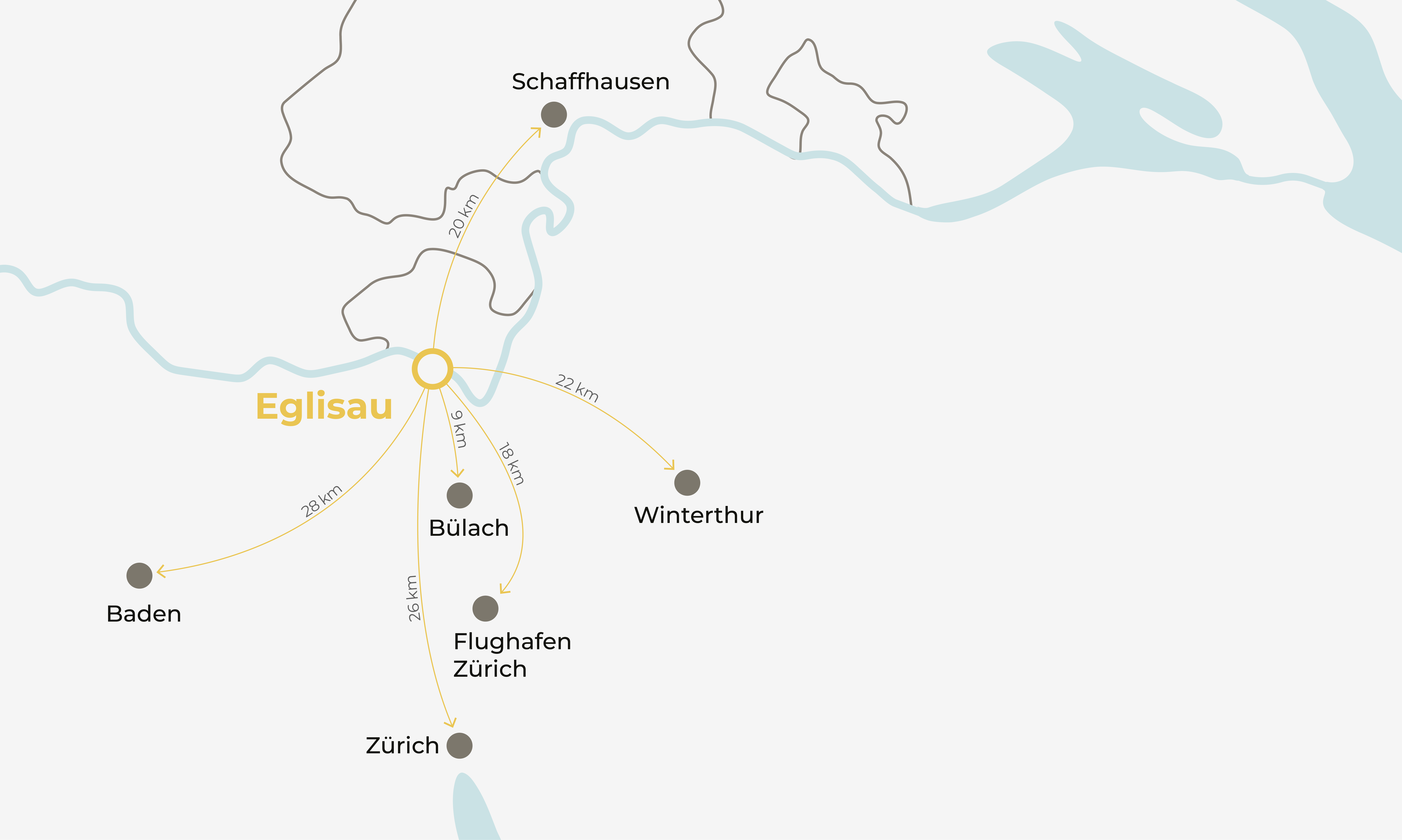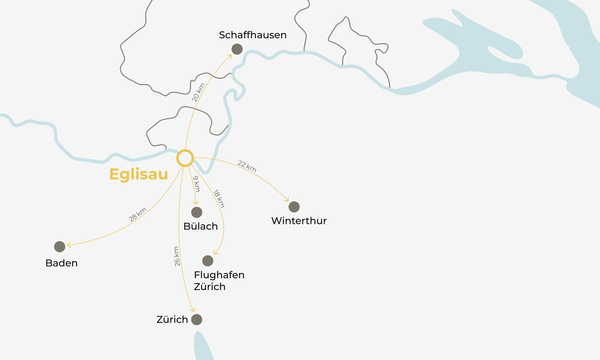 Die Gemeinde Eglisau gehört zum Bezirk Bülach und liegt im Kanton Zürich am Rhein. Die Einwohner profitieren hier vom Zusammenspiel zwischen ländlichem Erholungsraum und den Vorzügen urbaner Infrastruktur. Dank der Anbindung an den öffentlichen Verkehr, dem nahegelegenen Autobahnanschluss (A51) und dem Flughafen in der Nähe, ist Eglisau auch verkehrstechnisch attraktiv gelegen.